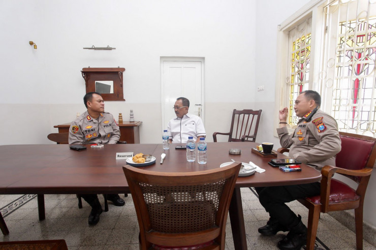 Didampingi Kapolrestabes Surabaya Kombes Pol Pasma Royce, keduanya saling mengobrol dan bersantai dengan saling melempar senyum saat ngopi bersama.