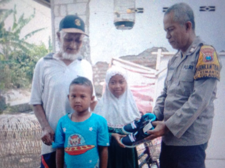 Mengetahui terdapat anak yatim piatu yang sekolah kelas 4 di SDN 2 Desa Kemantren, Tulangan, mengundang kepedulian Bhabinkamtibmas setempat dengan menghadiahi sepatu baru.