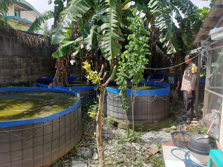 Bhabinkamtibmas Desa Kureksari Polsek Waru Aiptu Kurniawan, menunjukkan kepeduliannya terhadap ketahanan pangan Polresta Sidoarjo Polda Jatim dengan memberikan semangat dan dukungan kepada warga yang membudidayakan ikan lele di lahan kosong sekitar rumah mereka, Minggu (6/4/2025).