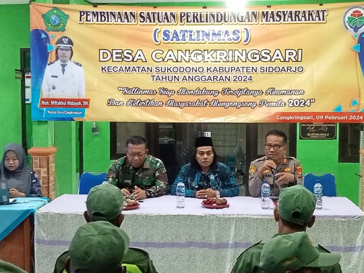 Kapolsek Sukodono AKP Supriyana memberikan materi bimtek kepada anggota Linmas Sukodono, Jumat (9/2/2024) di Balai Desa Cangkringsari, Sukodono, Sidoarjo.