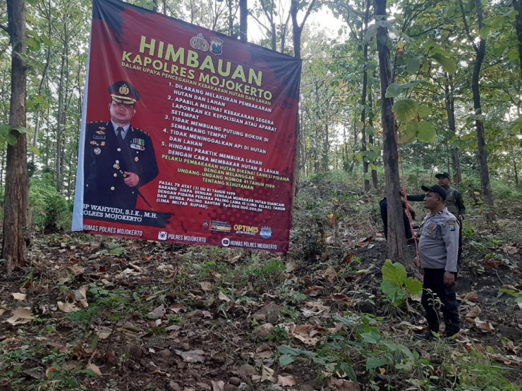 Oleh karena itu selain dengan patroli, Polres Mojokerto Polda Jatim melalui Polsek jajaran yang memiliki wilayah Kawasan hutan juga memasang banner himbauan untuk mencegah terjadinya karhutla.